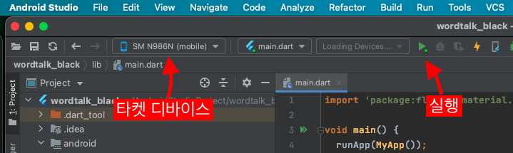 아래 화면과 같이 타겟 디바이스를 선택하고 연두색 실행(Run) 버튼을 누르면 된다.