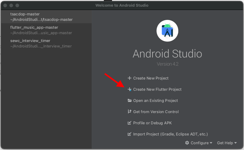 안드로이드 스튜디오 시작 후 웰컴 화면에서 Create New Flutter Project를 선택