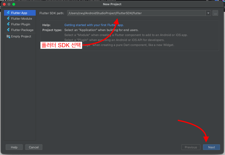 이미 설치된 Flutter SDK 위치를 선택 한 후 Next 클릭