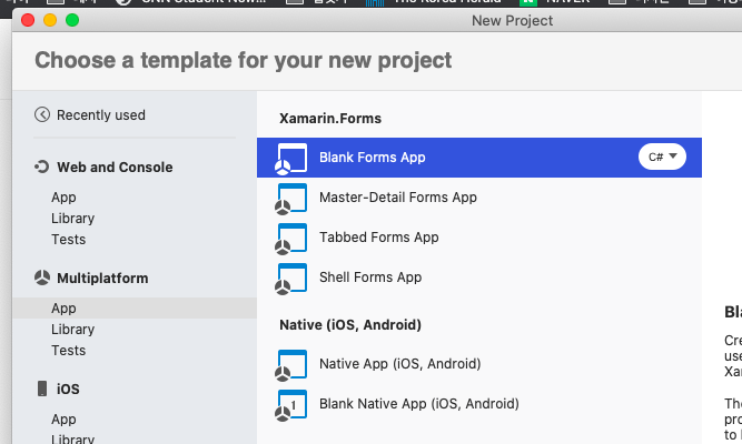 비쥬얼 스튜디오 시작 --> Multiplatform --> Blank Forms App 선택 후 Next