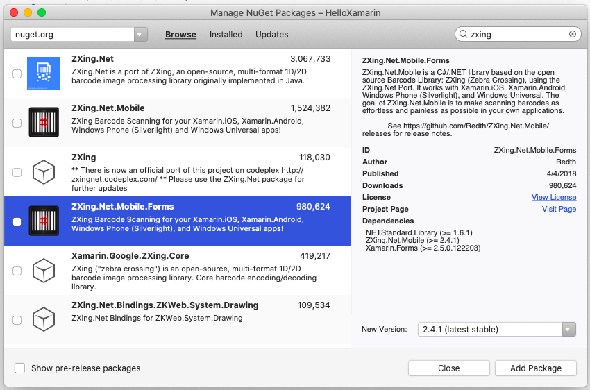 아래 그림과 같이 여러 패키지들이 검색되는데 여기선 ZXing.Net.Mobile.Forms 를 설치하도록 하자.
